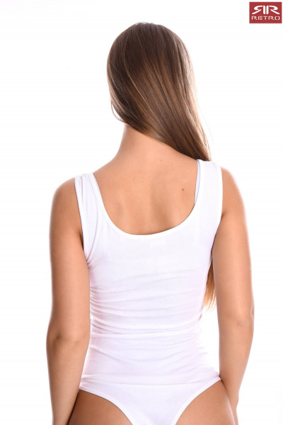 RetroJeans női body, fehér színben, mell részén filmnyomott márkajelzéssel a tavaszi Retro Jeans kollekcióból.