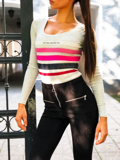 RetroJeans női hosszú ujjú body melíros szürke színben; kerek nyakkivágással; színes csíkos mintával, elején filmnyomott márkajelzéssel az őszi Retro Jeans kollekcióból.