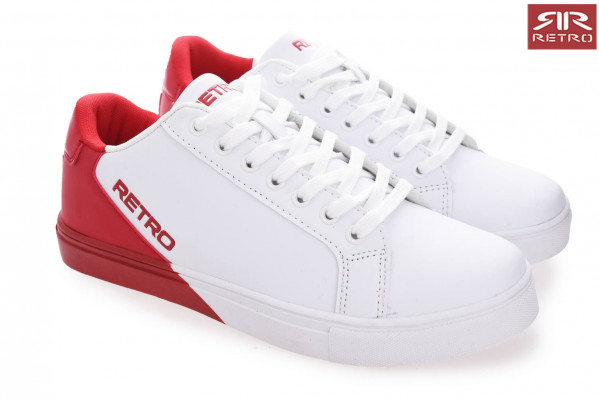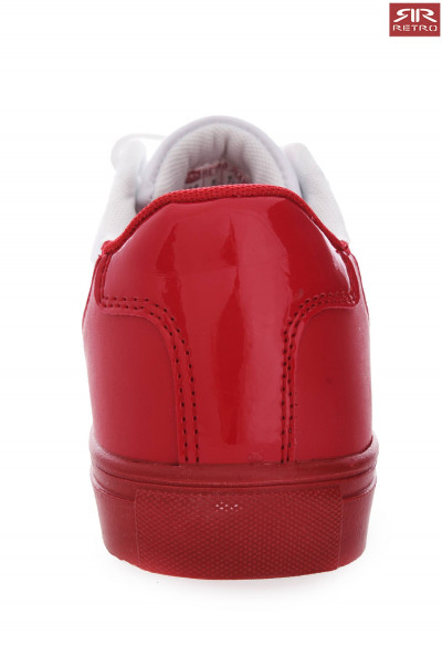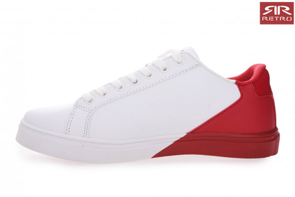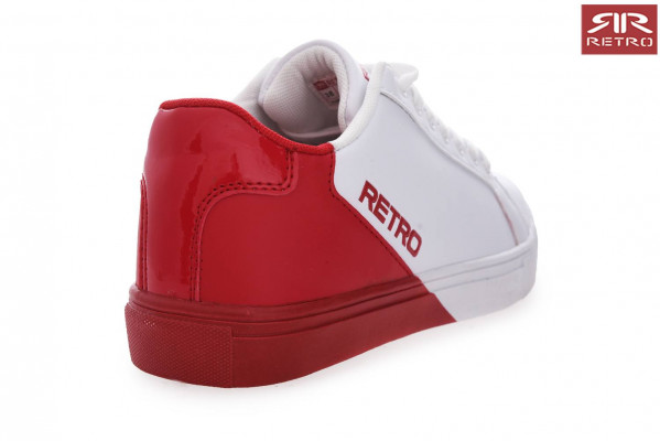 Női Retro Jeans - Calvina Sneakers – tornacipő, fehér (Off White) színben, sarok részénél piros színű, nyelvén és oldalán nyomott márkajelzéssel az őszi RetroShoes kollekcióból.