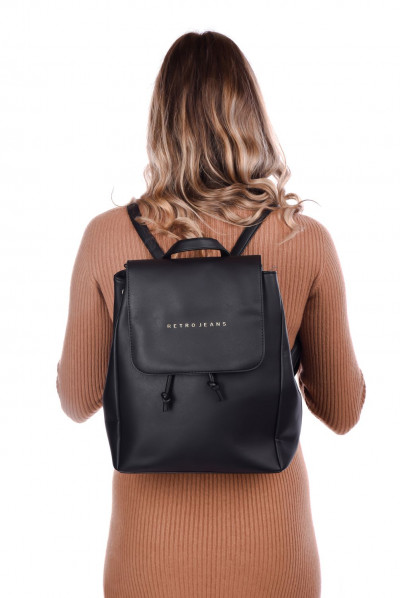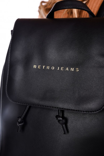 RetroJeans női bőrhatású batyus hátitáska, fekete színben, patentos fedéllel. Belseje egyterű, benn egy rekesszel és cipzáras zsebbel. Állítható pántokkal. Elején nyomott márkajelzéssel az őszi/téli RetroJeans kollekcióból.