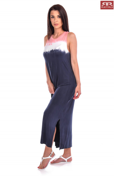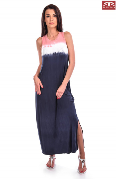 RetroJeans női maxiruha, batikolt színben, oldala felsliccelt, hátán csavart, háta nyaki részén filmnyomott márkajelzéssel a tavaszi RetroJeans kollekcióból.
