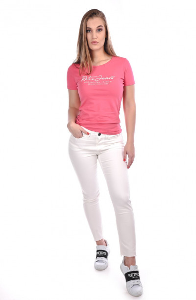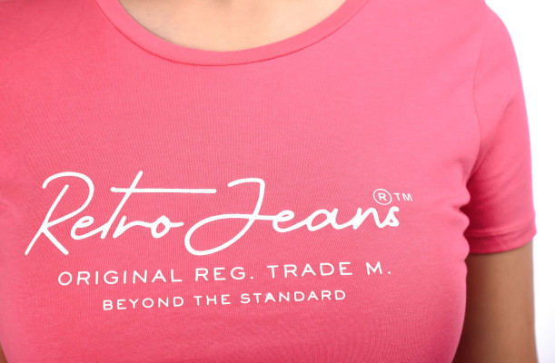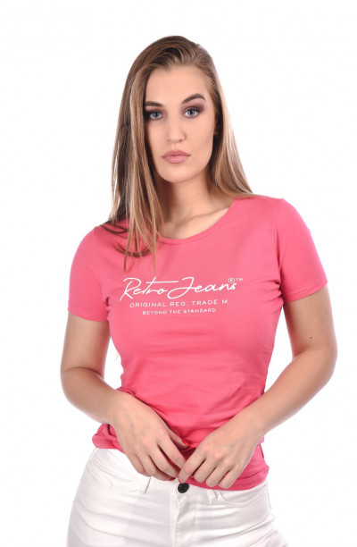 RetroJeans női póló, pink színben, kerek nyakkivágással, elején filmnyomott márkajelzéssel a tavaszi/nyári Retro Jeans kollekcióból.