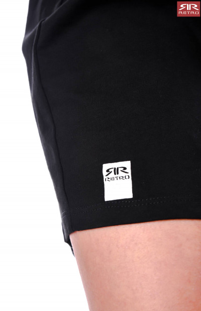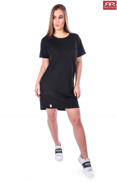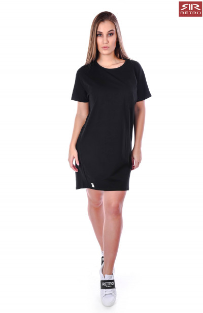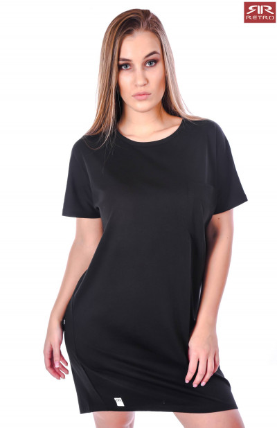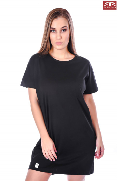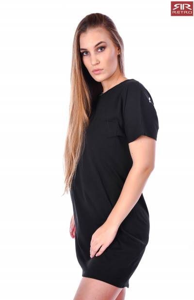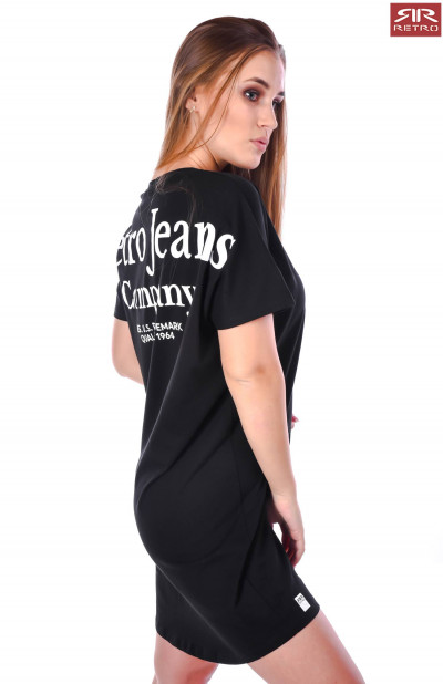 RetroJeans (Lori D) női póló ruha, fekete színben, hátul hosszított, mell részén zsebbel, alján és hátán filmnyomott márkajelzéssel a Retro Jeans kollekcióból.