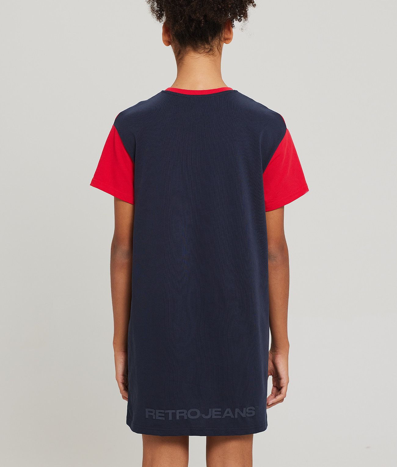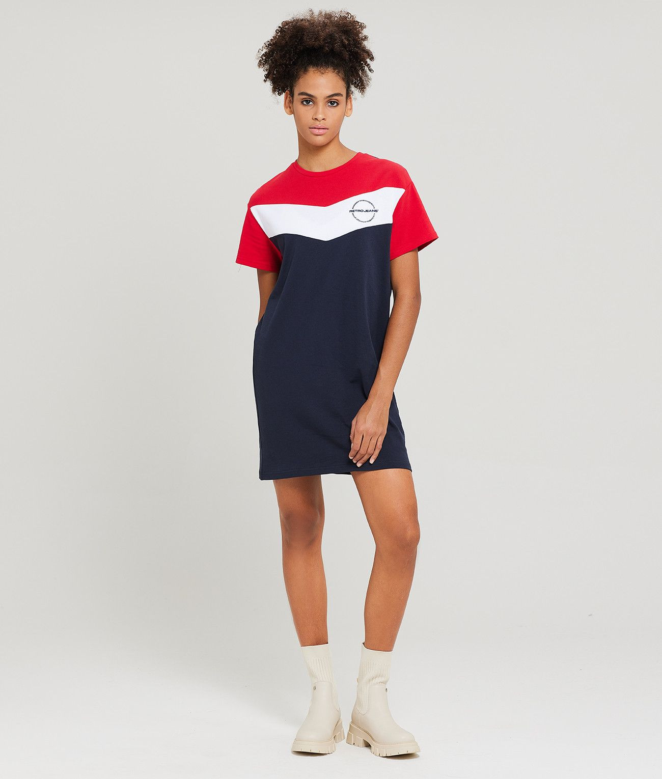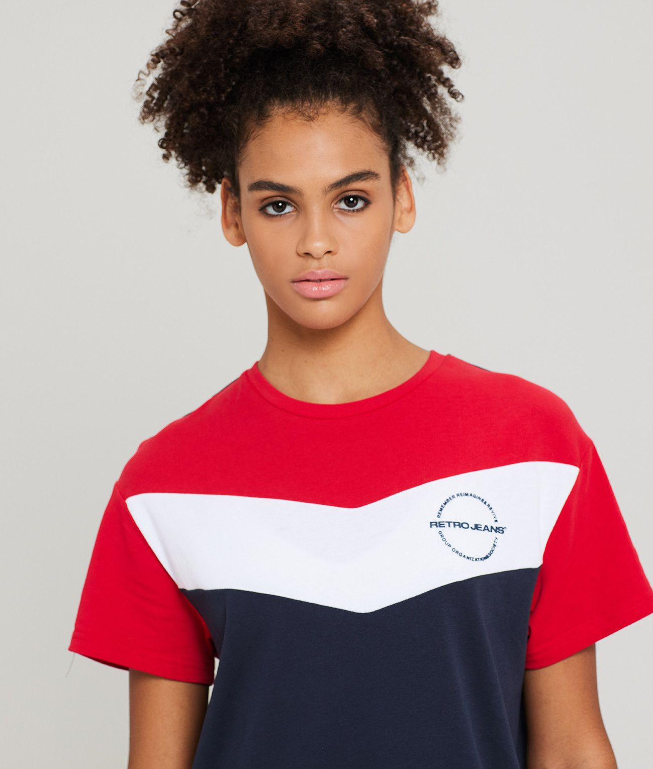 RetroJeans női tunika, piros-fehér-sötétkék színösszeállításban, kerek nyakkivágással, elején- és hátulján szilikon márkajelzéssel.