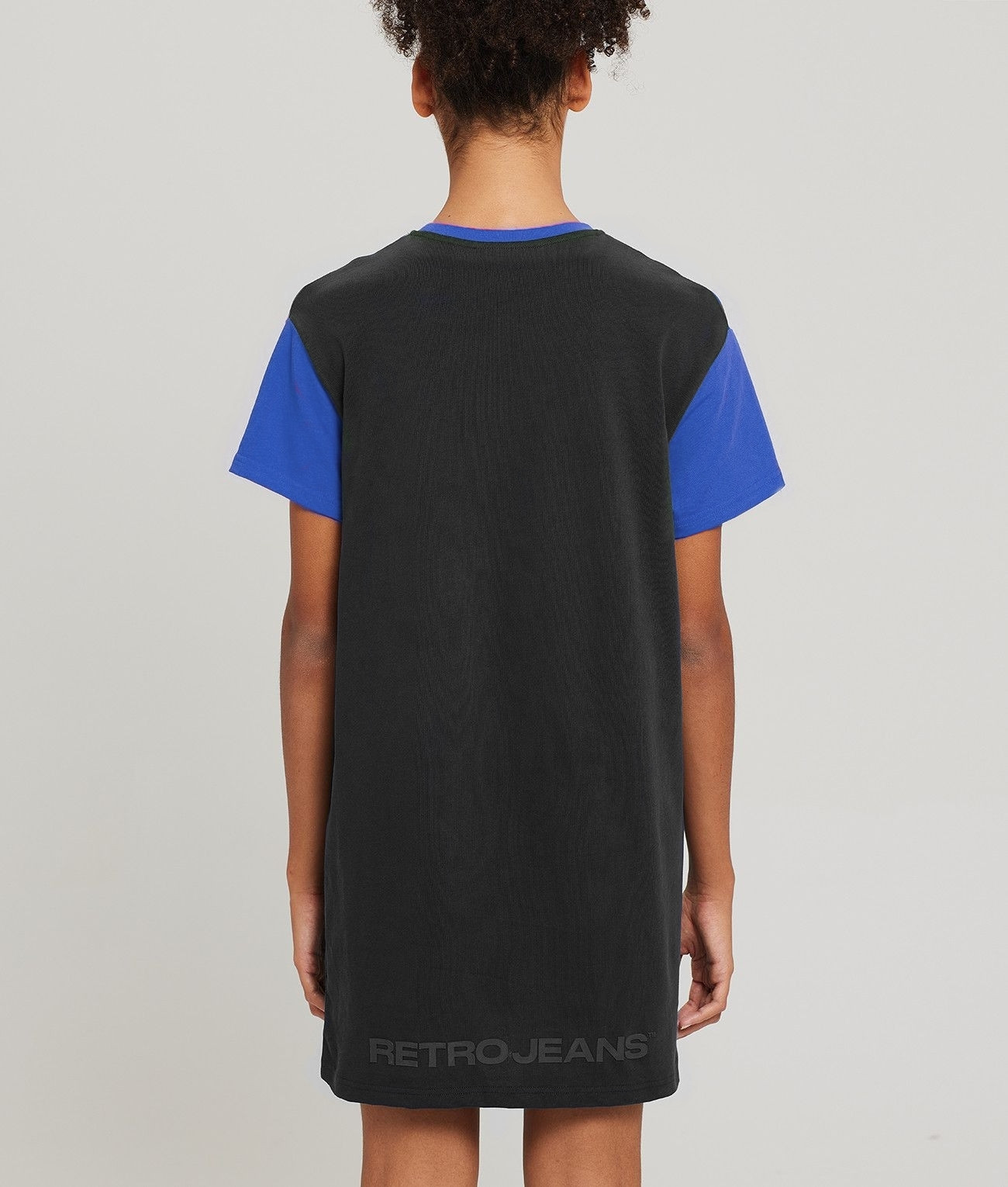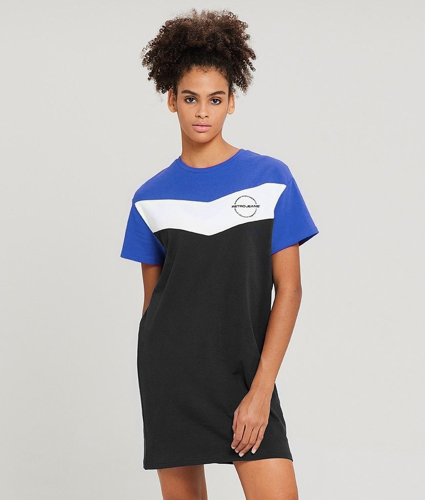 RetroJeans női tunika, kék-fehér-fekete színösszeállításban, kerek nyakkivágással, elején- és hátulján szilikon márkajelzéssel.