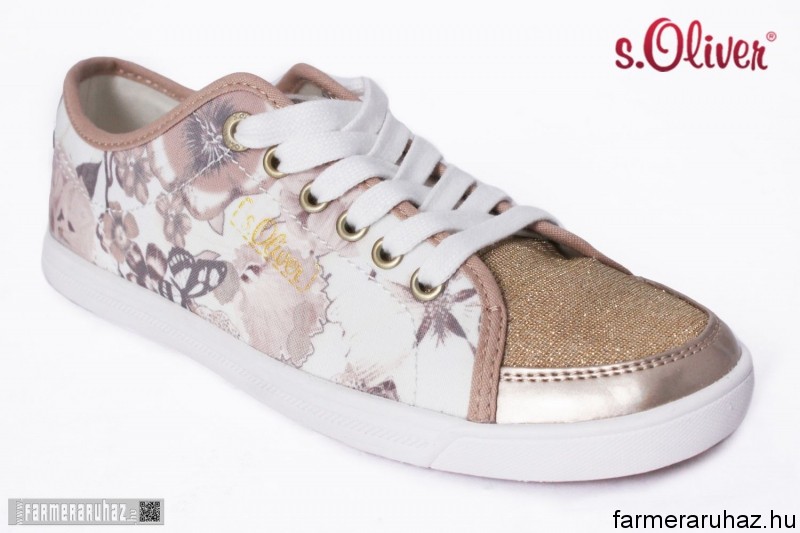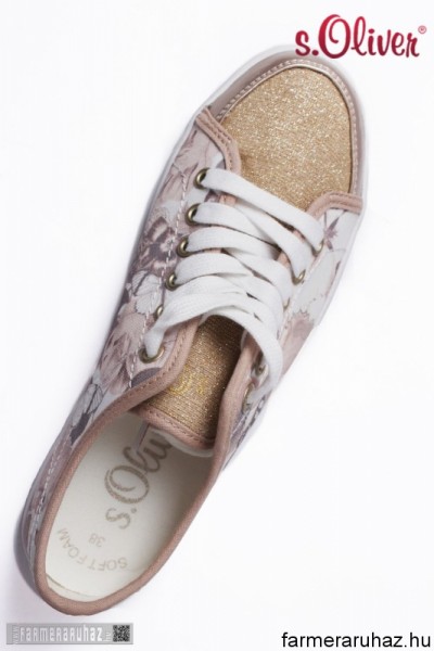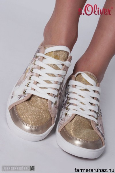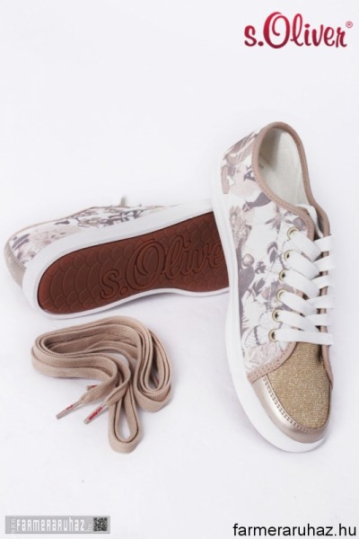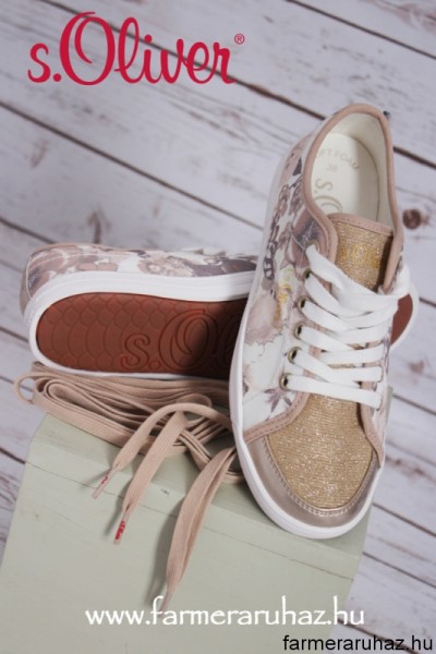 S. Oliver női cipő, bézs virágos textil alapanyagból, csillogós arany bettéttel, gumi talppal, sarkán rávart és nyelvén nyomott márkajelzéssel a 2016. tavaszi S.Oliver Shoes kollekcióból.