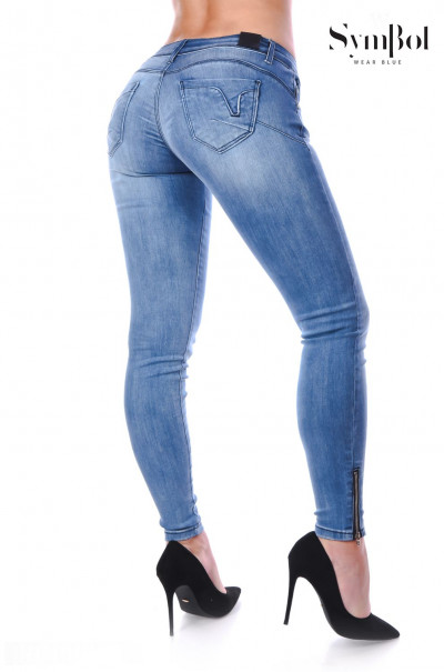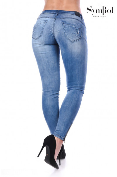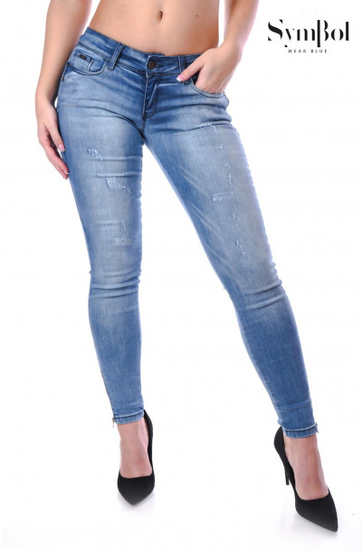 Symbol női farmernadrág farmerkék színben; koptatott- és szaggatott fazonban; derekán övbújtatóval; ötzsebes fazonban; elején gombos és cipzáras záródással; fenékformáló varrással; szárán cipzáras díszítéssel; derekán bőrhatású- zsebén fém márkajelzéssel a SymbolJeans kollekcióból.